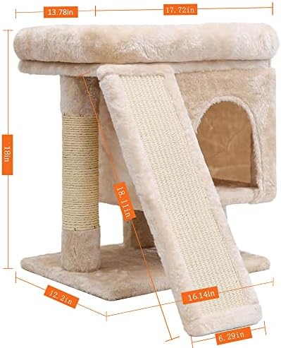 SYANDLVY Small Cat Tree for Indoor Large Cats, Kittens Condo with Scratching Post and Board, Modern Activity Tower with Cave (Beige)
