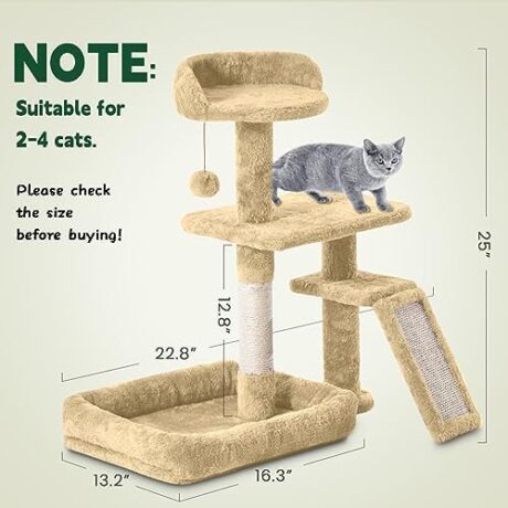 SYANDLVY Small Cat Tree for Indoor Large Cats, Kittens Condo with Scratching Post and Board, Modern Activity Tower with Cave (Beige)