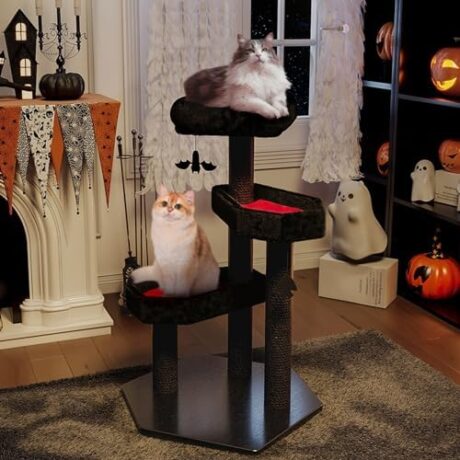 Happy & Polly Gothic Cat Tree with Coffin Bed – 40.9″Black Cat Tower with Soft Mats, Natural Sisal Scratching Posts, Bat Hanging Ball, Multi-Level Platform Cat Activity Center for Large Cats Halloween