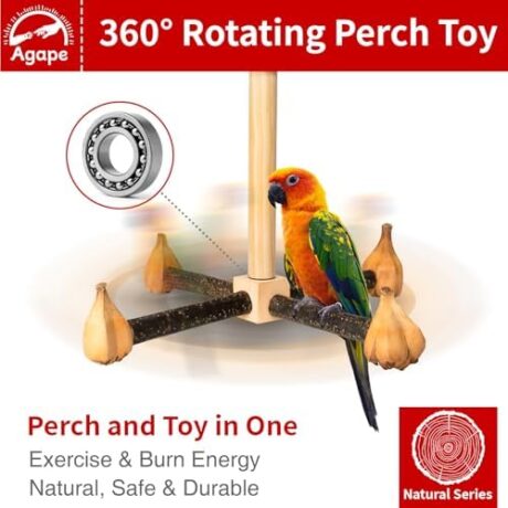 Agape Rotating Parrot Perch Toy with Chew Toy, Natural Wooden Perch Stand for Small & Medium Birds, Bird Cage Accessory with Exercise Wheel for Parakeets Cockatiels Lovebirds Conures Finches Budgies