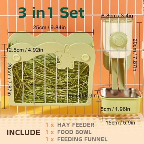 Rabbit Hay Feeder, 3-in-1 Feeding Set with Food Bowl and Hanging Funnel for cage, Hay Rack for Bunny Guinea Pig Chinchilla (Green)