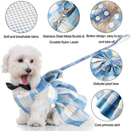 4 Pcs Cute Plaid Dog Dress Set with Bow Tie Harness & Leash for Small Dogs, Puppy Clothes for Girls Summer Outfits(S,Dark Color)