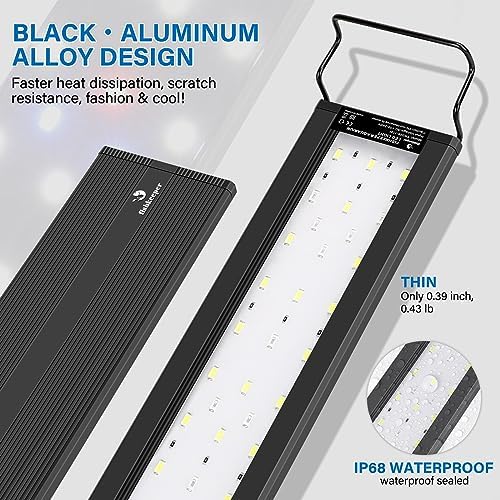 🟢【Well-designed by fishkeeper】This newly planted aquarium light features a fascinating minimal design with its ONLY 0.39IN thin body and weights 0.43 lbs for ultra lightweight design. Its high-quality aluminum housing not only ensures excellent heat dissipation and robust construction, but also adds premium feeling to aquariums.