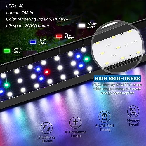 🔵【3 Lighting Modes & 5 Column Lamp】5 Columns of led chips which is brighter, more compact and beautiful. With 3 Color mode options: ➡Bluish White (white+red+blue+green); ➡Nature White(white+red+green); ➡Deep Blue, to meet your needs to take care of all kinds of fish and plants