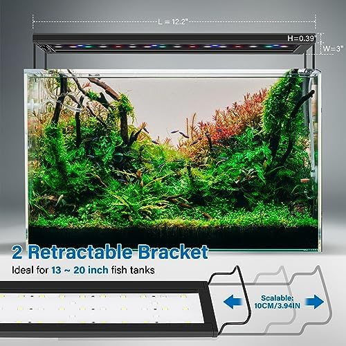 🔴【Length Extendable Up to 20 inches】Light body size: 12.2″L × 3″W × 0.39″H. Equipped with 2× extendable metal brackets(each length 16cm/6.3in), ideal for 12 ~ 20 inch length aquarium tanks. 7.2FT Longer power cord(UL safety listed), long enough and keep our aquarium hobby 100% safe. 💯1-year warranty, no stress return or refund, please do not hesitate to contact us first.