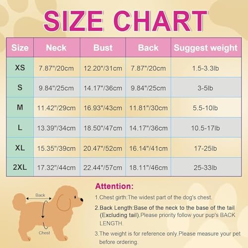 PinkBow Pets is a brand born from the desire to provide pets worldwide with FASHION CUTE and PRACTICAL DOG APPAREL & ACCESSORIES; DOG COLLARS, HARNESSES & LEASHES. 1 piece dog pajamas for small dogs pjs clothes puppy onesies outfits for doggie christmas shirts sleeper for pet cats jammies dog pajama for medium dogs yellow duck soft material stretchable dog pajamas onesie dog apparel Size Data X-SMALL: neck girth(7.87″/20cm), chest girth(12.20″/31cm), back length(7.87″/20cm), suggested weight(1.5-3.5lb) SMALL : neck girth(9.84″/25cm), chest girth(14.17″/36cm), back length(9.84″/25cm), suggested weight(3-5lb) MEDIUM : neck girth(11.42″/29cm), chest girth(16.93″/43cm), back length(11.81″/30cm), suggested weight(5.5-8lb) LARGE : neck girth(13.39″/34cm), chest girth(18.50″/47cm), back length(14.17″/36cm), suggested weight(8-15lb) X-LARGE : neck girth(15.35″/39cm), chest girth(20.47″/52cm), back length(16.14″/41cm), suggested weight(15-23lb) 2X-LARGE : neck girth(17.32″/44cm), chest girth(22.44″/57cm), back length(18.11″/46cm), suggested weight(23-30lb) The weight is for reference, please MEASURE your pet before ordering; Please priority follow the BACK SIZE; If your pet’s size is close to the upper limit of the size chart, please SIZE UP. Package Content : 1 pieces dog pajamas Recommend Breeds of Dog:Kitten, Cat, Tiny Puppies, Teacup, Chihuahua, Yorkie, Pomeranian, Maltese, Toy Poodle, Bichon, Min Pin, French Bulldog, Poodle, Shih Tzu, Spaniel Westie, Pug, Boston Terrier, Chiweenie, Corgi, Cairn Terrier, Havanese, Mini Schnauzer, Dachshund, Jack Russell terriers, West Highland White Terrierstriped dog tee shirt for small dogs teacup chihuahua yorkie puppy clothes tank tee-purple and pink strips 1 pieces puppy dog pajamas cute pet jumpsuit soft puppy rompers pet dog cute clothes onesies fall summer puppy bodysuits for pet puppy dog doggie.